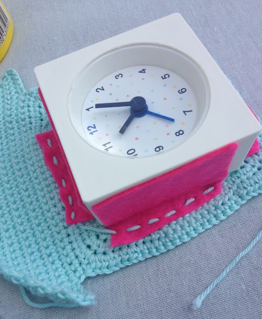 Ook plakte ik stukken papier over het vilt van de zijkanten van het klokje heen.